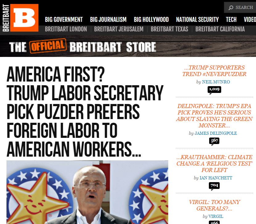 The opponents -- some of whom backed Trump’s pro-American, immigration-reducing promises in the election -- are rallying opposition to Puzder’s appointment via the twitter hashtag, #NeverPuzder.