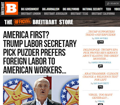 President-elect Donald J. Trump is expected to name as his Labor Secretary fast food executive Andy Puzder, who stands diametrically opposed to Trump’s signature issues on trade and immigration -- which won him the election....Wow -- the Trump News Network is linking a Trump appointee to the hated rootless cosmopolitan gun-grabber Mike Bloomberg. Them's fightin' words.